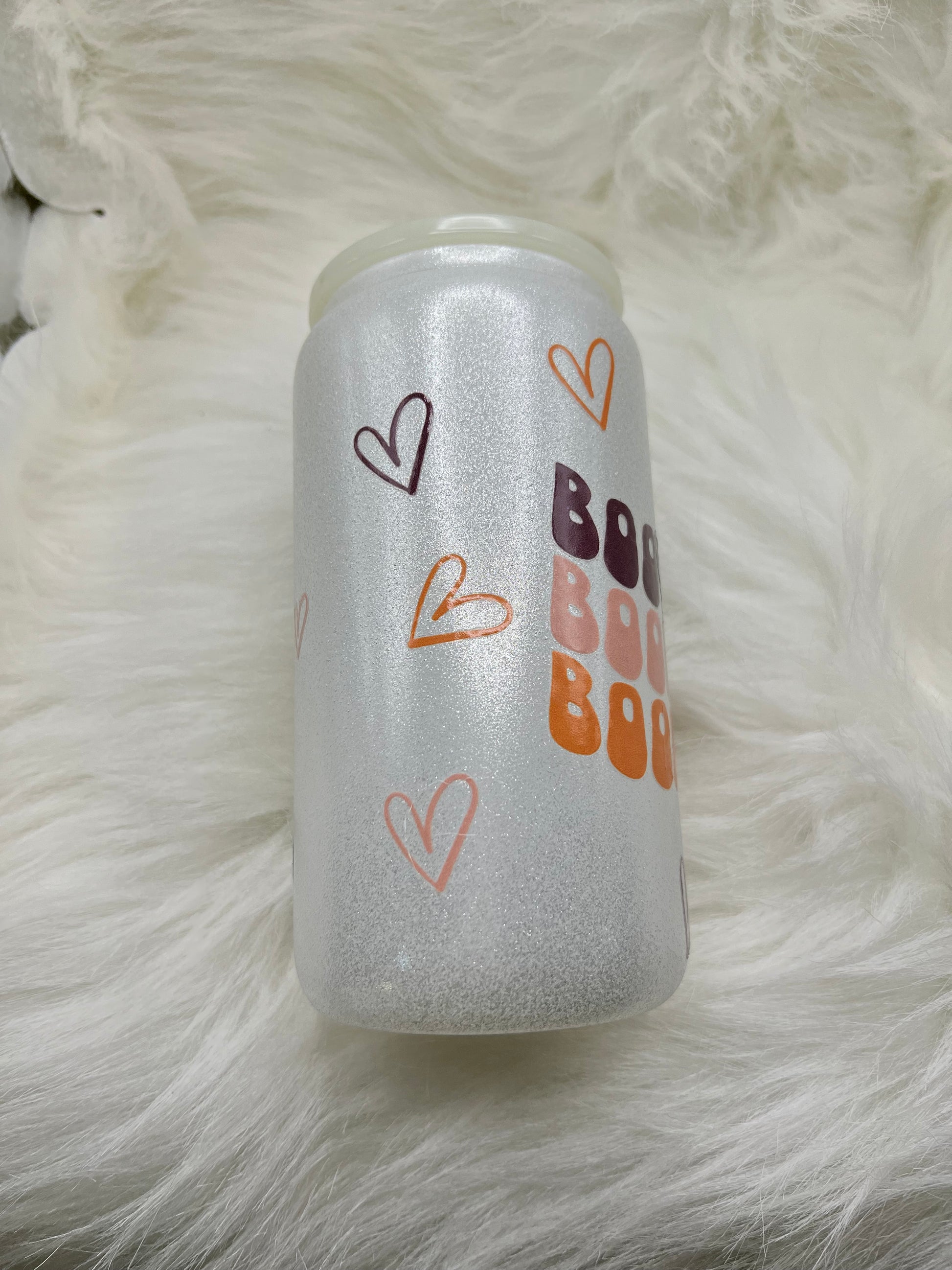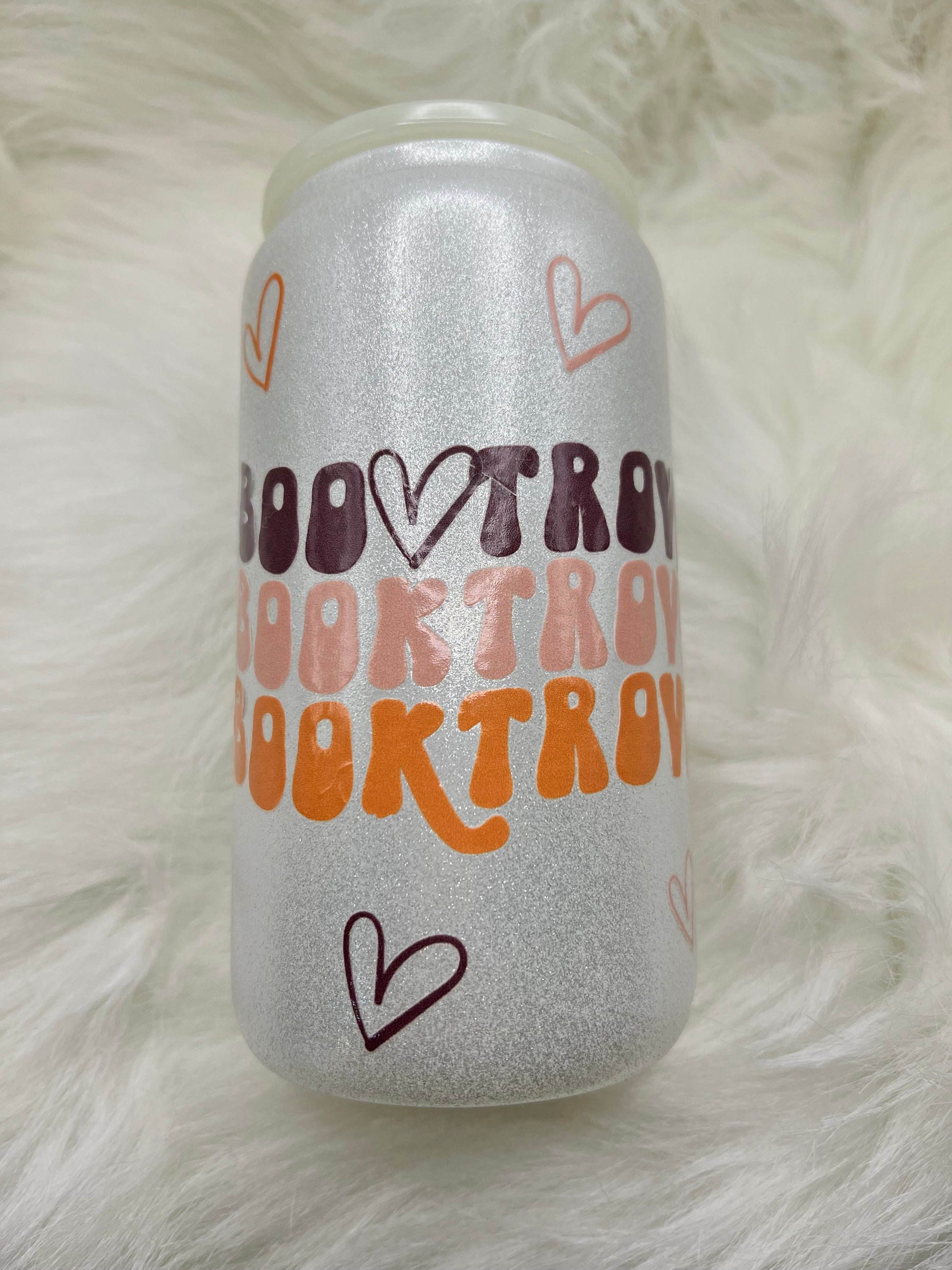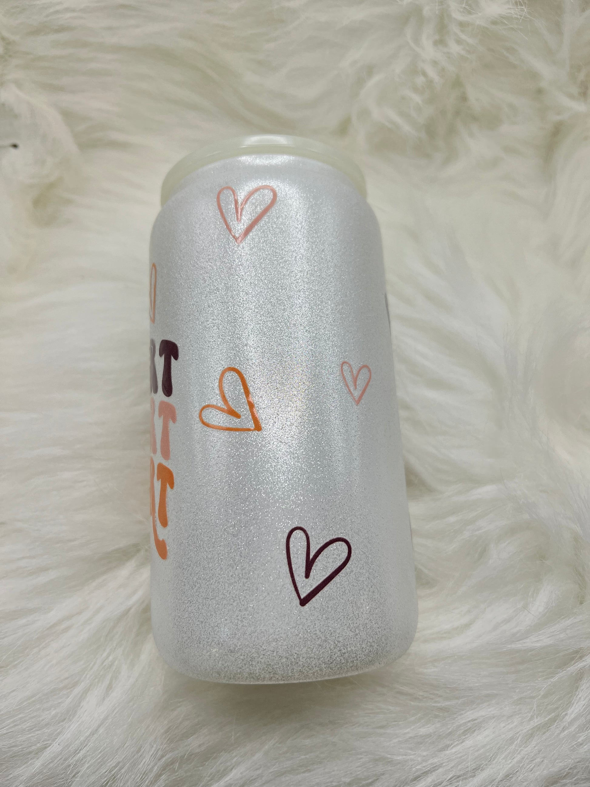 White Rough Glitter 16 oz Glass Can with Uvdtf image. Acrylic lid and straw included.