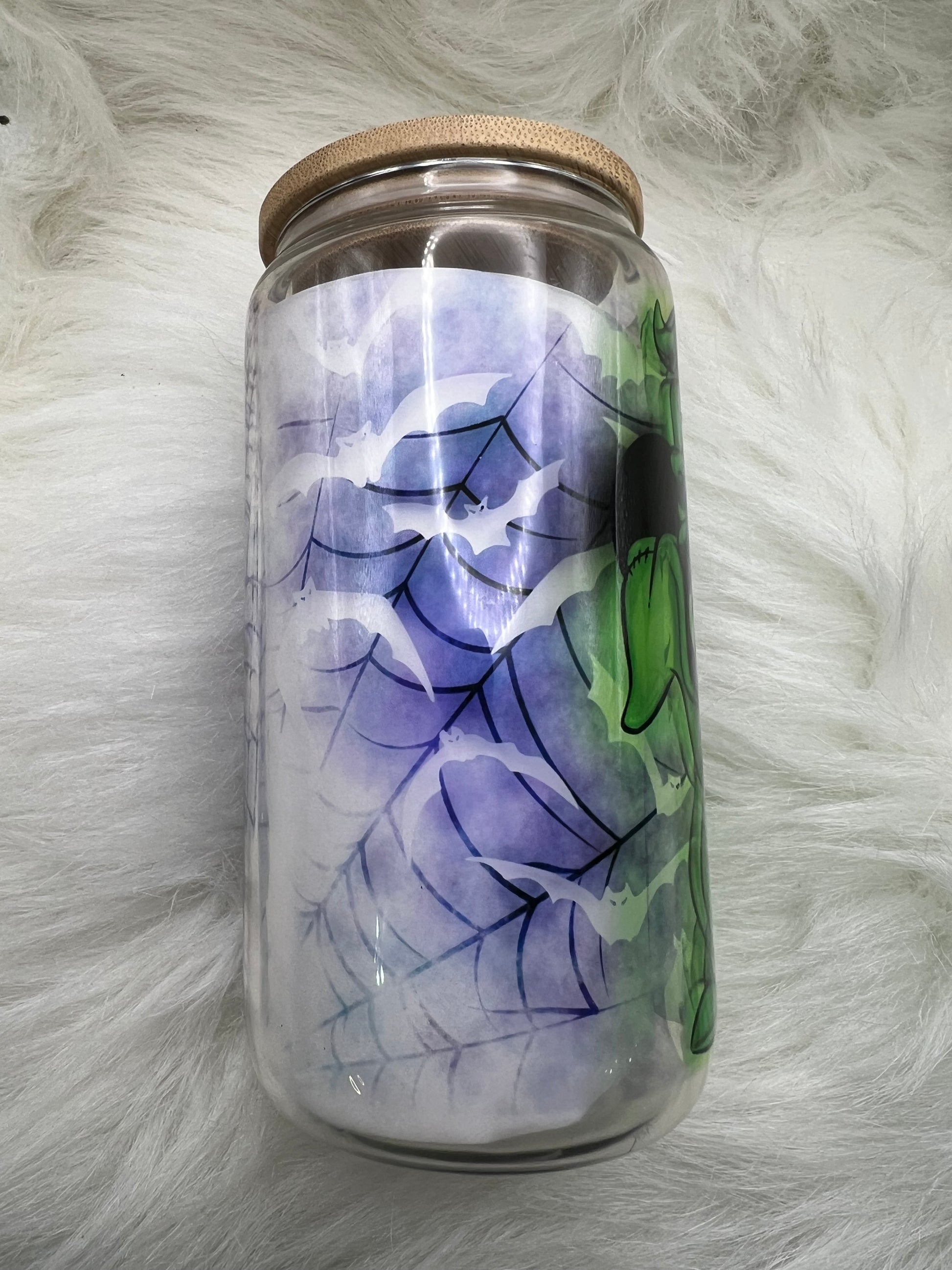 Sublimated 16 oz Glass can with Bamboo lid. Straw Included