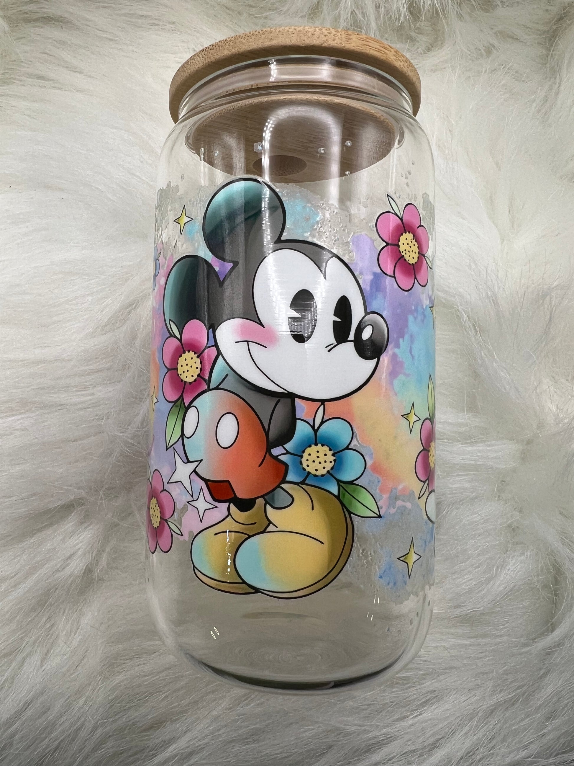 16 oz glasscan with Uvdtf design. Bamboo lid and straw included